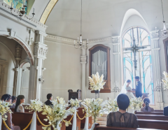 アンティークのステンドグラスが輝く中での挙式は、感動と祝福に包まれる特別な瞬間です。